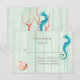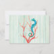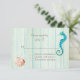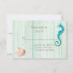 Belle carte de réponse mariage à thème de plage, avec une mousse verte de mer lavée à l'aspect arrière - plan en bois. Les graphiques d'un cheval de mer turquoise et coquillages décorent la carte. Personnalisez tout le texte pour votre mariage à la plage. Des invitations assorties et d'autres produits sont disponibles.