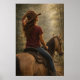 La lumière dorée filtre à travers les arbres tandis qu'un cavalier s'arrête le long d'un sentier forestier tranquille. Cette œuvre d'art western paisible capture un moment de réflexion et de liberté à cheval sous la lumière chaude de l'après-midi.