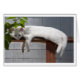 Chaton blanc se reposant sur la barrière ; le blanc comique drôle paresseux de carte de voeux d'yeux bleus de chaton pour customisent des mots