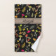Cette belle serviette à main chic de campagne a un arrière - plan noir avec des champignons rose, orange et vert. Interpersés sont des branches de feuillage en vert et gris. Des coléoptères verts et des escargots oranges donnent un ton fantaisiste à ce design. La serviette peut être personnalisée avec votre choix d'un nom ou d'initiales.