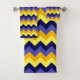 Un ensemble de serviettes de bain avec un design motif mignon et ombragé de chevrons en bleu, jaune et or.
