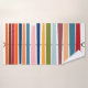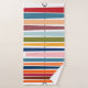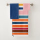 Ce kit de serviettes est doté d'une serviette de bain au design moderne du milieu du siècle de lignes horizontales de couleur sur une ligne verticale noire avec des cercles, un linge rose et une serviette bleue.