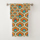 Serviette de bain moderne du milieu du siècle. motif de flamme. Couleurs rouge, turquoise, jaune et marron.