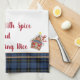 Cette serviette de cuisine est présentée en bleu saphir et tan plaid avec des rayures bronzées. Paroles de "Bienheureux avec épices et tout ce qui est bien" en rouge. Montré sur une serviette blanche, avec des accents maison en pain d'épice de Noël. Customisez cet objet ou achetez tel que conçu.