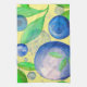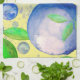 Serviette de cuisine avec une image de bleuets et de feuilles verts contre un arrière - plan jaune pâle.