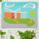 Cette serviette de cuisine moderne de la maison de dessin animé moderne du milieu du siècle vous donnera envie de sortir le tapis BIENVENUE et de vous faire comme chez vous ! Dans les années 1960, le design minimaliste de l'art se compose d'une élégante maison en pierre orange et en verre d'eau sur une pelouse luxuriante en forme de boomerang et verte. La pelouse forme une oasis au milieu de son environnement gris et bétonné. Un palmier vert se balance dans la brise. Quatre marches oranges mènent à la porte d'entrée rétro, rouge, avec trois vitres rectangulaires en verre. A gauche de la porte, un fleuron turquoise abrite un plante tropical vert. La maison a un toit blanc en forme de V incliné qui pointe vers deux nuages blancs en forme de haricots rouges. Le ciel est un ombrage d'aqua positivement serein. Personne ne voudra jeter des pierres de ce design moderne de maison en verre ! Achetez ce kitschy, produit de l'ère spatiale et soyez le chat le plus cool de votre bloc !
