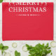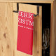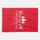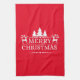 Serviette de cuisine en rouge avec imprimé Joyeux Noël. Customisez cet objet ou achetez tel quel.