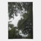 Cette superbe serviette de cuisine est ornée d'une photo prise à l'intérieur d'une forêt dense. La photo montre l'obscurité des arbres et une petite zone de ciel gris. Le résultat est une scène étrange et atmosphérique.