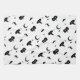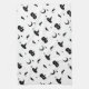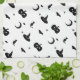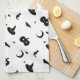 Serviette de cuisine d'Halloween avec un Arrière - plan blanc et Éffrayant mais jolies silhouettes d'Halloween de chats, chauves-souris, étoiles, lunes, bonbons et Casquettes de sorcière. Art par Sara Motolanez