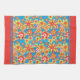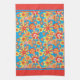 Serviette de cuisine de style champêtre ou serviette de thé, avec un motif de fleurs rouges, orange et jaunes sur un arrière - plan turquoise clair, d'un collage en papier peint à la main par Judy Adamson, avec une bordure rouge à chaque extrémité.
