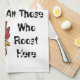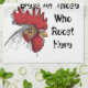 "Bénissez tous ceux qui dorment ici" est la légende sur cette serviette de cuisine avec une tête de poulet blanche. Customisez cet objet ou achetez comme indiqué. Image stock freepik.com