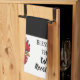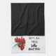 "Bénissez tous ceux qui dorment ici" est la légende sur cette serviette de cuisine en noir et blanc avec une tête de poulet blanche et rouge. Customisez cet objet ou achetez comme indiqué.