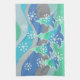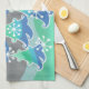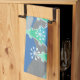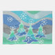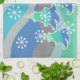 Un paysage hivernal moderne et stylisé avec des pins gelés et des flocons de neige étincelants. Serviette de cuisine avec un design personnalisable vert, bleu, gris argenté et blanc pour vous permettre de personnaliser avec votre propre texte, images et idées. Image créée à l'aide d'un dessin au crayon de couleur numériquement amélioré.