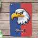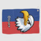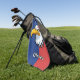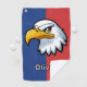 Cette serviette de golf personnalisée présente un dessin déterminé de tête d'aigle de dessin animé contre un arrière - plan bleu et rouge éclatant.