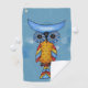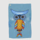 Cette serviette de golf est bleue avec un motif de cercles et de pointes bleus et une chouette d'imaginaire colorée avec de grands yeux ronds bleus, la tête bleue et un corps jaune.