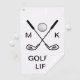 La conception de serviette de golf du monogramme des hommes avec l'image des clubs de golf et d'une boule de golf qui forment un emblème décoré d'un monogramme avec les initiales nommées vous peut customiser en ligne. Créé dans noir et blanc classique.
