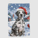 Ce design festif reflète l'esprit joyeux de la période des fêtes, avec un adorable petit portant un chapeau de Père Noël. Le chien est niché dans un pays des merveilles hivernales, avec un bonhomme de neige, un sapin de Noël décoré et des cadeaux joliment emballés. Les flocons de neige tombent doucement, ajoutant une touche magique à la scène, tandis que les couleurs vives des décorations de vacances créent une atmosphère chaleureuse et joyeuse.