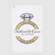 Serviette de golf amusante pour un week-end de golf de fête de bachelorette ou pour les festivités et les activités de mariage - voici une serviette de golf blanche avec une bague de fiançailles à personnaliser avec le nom du couple et la date du mariage. Autour de l'anneau, il est écrit - dernier swing avant la bague. Accessoires de golf personnalisés pour vous-même ou votre joueur de golf préféré. Préparez-vous à démarrer dans le style avec nos accessoires de golf amusants, parfaits pour ajouter une touche de classe et d'humour à votre enterrement de vie de garçon ou votre week-end de mariage ! Notre collection de golf présente un graphique charmant d'une bague de fiançailles avec un gros diamant, ce qui en fait un ajout ludique et élégant à votre aventure golfique. Que vous jouiez sur les liens avec vos meilleurs amis ou que vous célébriez vos prochaines noces, ces accessoires de golf sont indispensables pour l'occasion. Alors attrapez vos clubs et pré