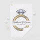 Serviette de golf amusante pour un week-end de golf de fête de bachelorette ou des festivités et des activités de mariage - voici une serviette de golf blanche avec une bague de fiançailles à personnaliser avec le nom du couple et la date du mariage. Autour de l'anneau, il est écrit - dernier swing avant la bague. Accessoires de golf personnalisés pour vous-même ou votre joueur de golf préféré. Préparez-vous à démarrer dans le style avec nos accessoires de golf amusants, parfaits pour ajouter une touche de classe et d'humour à votre enterrement de vie de garçon ou week-end de mariage ! Notre collection de golf présente un graphique charmant d'une bague de fiançailles avec un gros diamant, ce qui en fait un ajout ludique et élégant à votre aventure de golf. Que vous jouiez sur les liens avec vos meilleurs amis ou que vous célébriez vos prochaines noces, ces accessoires de golf sont indispensables pour l'occasion. Alors attrapez vos clubs et préparez