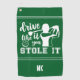 Drôle serviette de golf verte et blanche personnalisée avec votre monogramme/initiales. Le texte dit : "Conduis-le comme tu l'as volé."