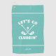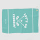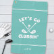 This light teal golf towel features a cheeky design with two crossed clubs, a golf ball on a tee, and whimsical white typography that reads “Let’s Go Clubbin’.” Framed by crisp accent stripes, the layout is bold, modern, and fun — perfect for golfers who appreciate clever wordplay and standout style. The bottom section includes a template for monogram, name, or custom text. Great for tournaments, gifts, or everyday play.