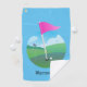 Illustration simple avec un drapeau de golf rose sur un putting green. Nous avons ajouté un arrière - plan bleu ciel au design, mais n'hésitez pas à changer cela. Ajoutez votre nom à la serviette de golf pour personnalisation. Fait aussi un merveilleux cadeau pour une dame golfeuse.