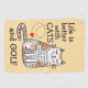 Joli doodle amusant d'un chat assis les yeux fermés, joues roses et taches bronzantes. À sa gauche, on trouve les mots "la vie est meilleure avec les chats et le golf dans une police noire amusante. Un petit coeur d'amour rouge bourdonne depuis la lettre C et l'arrière - plan est de couleur beige.