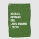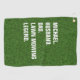 Une serviette de golf Lawn Mowing Legend audacieuse avec une typographie blanche propre sur un fond à texture d'herbe réaliste.