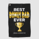 Serviette de golf moderne pour stepdads cette fête des pères, ou anniversaire, avec le texte qui dit "MEILLEUR BONUS DAD EVER" en or et noir, personnalisée avec vos stepdads initiales et les noms des enfants (peut également être laissé vide).