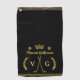Ces serviettes de golf font le cadeau parfait pour un golfeur passionné. Personnalisé avec son nom et ses initiales, le design comprend également des clubs de golf, des balles, une couronne et une couronne de laurier. Le design est fait en or sur un arrière - plan noir (Customiser / Personnaliser Continuer pour changer la couleur arrière - plan).