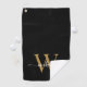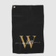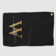 Monogramme noir et or Elégant Fille Moderne Nom initial Signature Script personnalisé Serviette de golf personnalisée. Ce design avec votre prénom dans une jolie typographie de police de queue d'essuie-glace (ou calligraphie) à la main avec un monogramme initial en or et blanc sur noir. Ils sont faciles à customiser. Grand cadeau d’anniversaire féminin élégant, aussi pour la journée de la mère, anniversaire, mariage, soirée bachelorette, douche nuptiale et C’est pour la fille qui aime des choses propres et minimalistes uniques.