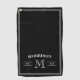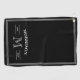 Serviette de golf noire et blanche imprimée avec votre nom de famille dans une arche au cours de votre initiale et l'année où votre famille a été établie.