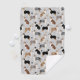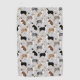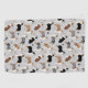 De mignons bergers australiens / chiens australiens en manteaux noirs, bruns et merles s'assoient et tiennent des os et des empreintes de pattes de chien éparpillés sur un arrière - plan gris clair.