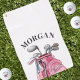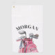 This cute monogram golf towel features the top half of a pink watercolor golf bag with clubs at the bottom, with the golfer’s name elegantly curved above the bag and clubs for a personalized touch. A single initial monogram appears on the bag, seamlessly blending into the watercolor design. The soft pink tones and subtle gray accents keep the look modern and feminine. Perfect for the lady golfer in your life, this stylish golf towel makes a thoughtful gift for Christmas, birthdays, Mother’s Day, or any special occasion.
