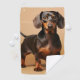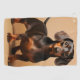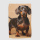Ce portrait d'un chien Dachshund, présenté avec un haut degré de réalisme, montre le chien placé devant et au centre, avec des yeux clairs et expressifs qui sont accentués par les marques de bronzage du chien. Son manteau est brillant et élégant, avec des nuances de chocolat riche et bronzé. Les oreilles du Dachshund sont généralement longues et sombres, encadrant son visage avec une élégance douce. La queue est en hauteur avec une légère courbe, indiquant un état de vigilance ou de curiosité. L'arrière - plan est un ton neutre et chaleureux qui complète le manteau du chien et met en valeur son contour sans distraction. L'éclairage sur le chien est doux mais précis, jetant des ombres subtiles qui accentuent sa construction musculaire et la forme unique et allongée typique de la race.