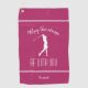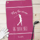Cette serviette de golf mignonne et moderne présente la citation « Que le parcours soit avec vous ! » avec la silhouette d'une golfeuse en blanc sur un fond rose chic avec des bordures blanches accentuées. Un modèle personnalisable vous permet d'ajouter un nom, des initiales ou une courte ligne de texte.