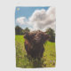 Vache noire des hautes terres pâturant le soleil du champ vert. Photographie d'une majestueuse vache écossaise noire des montagnes sur un terrain vert d'été avec de l'herbe en bouche et des fleurs chicorées devant. Dans l'arrière - plan il y a un beau ciel bleu et nuageux. Disponible sur de nombreux produits allant des imprimés aux fournitures de fête et aux équipements sportifs.