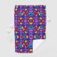 Vibrant towel featuring a symmetrical pattern of purple, blue, and yellow abstract shapes. The design conveys a lively and colorful tone.