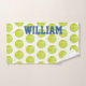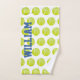 Serviette de main de la sueur du joueur de tennis faite dans le blanc avec un motif jaune de balle de tennis. Le grand texte bleu audacieux est prêt à personnaliser pour lire ce que vous voulez.