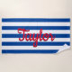 Cette serviette de plage à rayures bleues et blanches. Personnalisez cette serviette de plage avec votre nom ou le texte de votre choix qui apparaît en gros caractères rouges sur la longueur de la serviette.