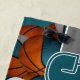 Cette serviette de plage amusante pour les joueurs de basket-ball dispose de boules de basket de taille variée avec des couleurs d'équipe turquoise et grise tournées partout sur un numéro de maillot turquoise arrière - plan et proéminent en turquoise sur une bande de couleur gris pleine longueur, sur laquelle vous pouvez également personnaliser le nom de l'athlète, nom de l'équipe et nom de la mascotte - par katz_d_zynes