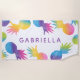 La serviette de plage de style tropical est ornée d'une bordure vibrante d'ananas de couleur arc-en-ciel avec un dégradé de couleur cravate-aquarelle. Personnalisez le texte personnalisé moderne violet avec un monogramme de votre prénom ou de votre nom.