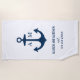 Le design moderne de la serviette de plage mariage nautique comprend un monogramme mariage de la mariée et du marié affiché à l'intérieur d'une ancre de bateau, et un texte supplémentaire personnalisé pour les noms et la date du mariage. Couleurs bleu marine et blanc.