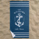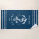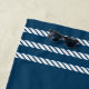 Ancre nautique Lake House La serviette de plage bleue de la Marine comporte une grande ancre de bateau au centre de la serviette sur un arrière - plan bleu marine avec des cordes rayées au-dessus et en dessous du design. Personnalisez-le avec votre nom de famille et la date fixée. Parfait pour une maison de lac, des maisons de plage en bord de mer, des chalets en bord de mer et des réunions de famille.