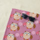 Cette magnifique serviette de plage est dotée d'une chouette brune aux yeux somptueux. Le hibou tient un joli ballon rose pâle et un bouquet de fleurs rose vif enveloppé d'un cône rose pâle.