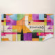 Belle conception abstraite avec des aquarelles géométriques de cercles et rectangles en violet, orange, bleu et vert ajoute une belle touche de sophistication à votre plage ou piscine. Personnalisez avec un nom dans une typographie décontractée imprimé à la main fait une grande serviette digne de la plage!