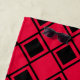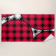 Cette serviette de plage a un design moderne du milieu du siècle de diamants noirs solides à l'intérieur des contours en losange noir avec des lobs roses sous eux, le tout sur un champ de blanc.