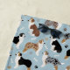De mignons bergers australiens / chiens australiens en manteaux noirs, bruns et merles s'assoient et tiennent des os et des empreintes de pattes de chien éparpillés sur un arrière - plan bleu clair.