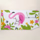 Voici une serviette de plage claire et colorée qui le déclare "Beach Time" et porte aussi votre nom. L'image centrale est un grand flamant rose. Le flamingo est encadré de feuilles tropicaux, de fleurs, d'un perroquet rose et même d'un cactus. Les couleurs utilisées sont le vert, l'or et le rose. Tout est posé sur un arrière - plan blanc.