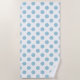 Cette serviette de plage présente de grands pois bleu clair sur le blanc.
